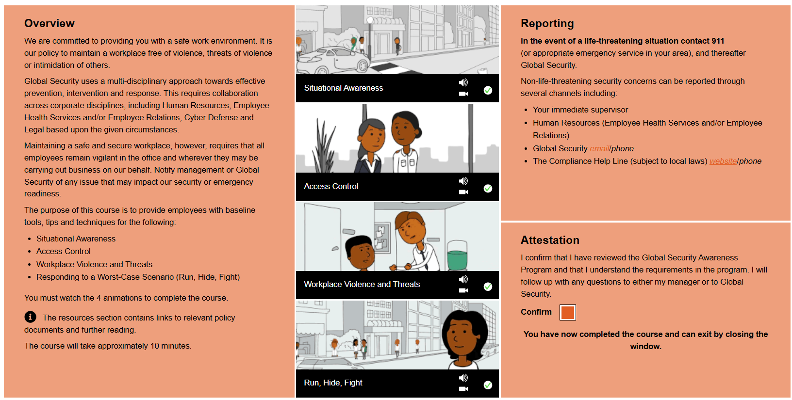 Global Security uses a multi-disciplinary approach towards effective prevention, intervention and response. This requires collaboration across corporate disciplines, including Human Resources, Employee Health Services and/or Employee Relations, Cyber Defense and Legal based upon the given circumstances.